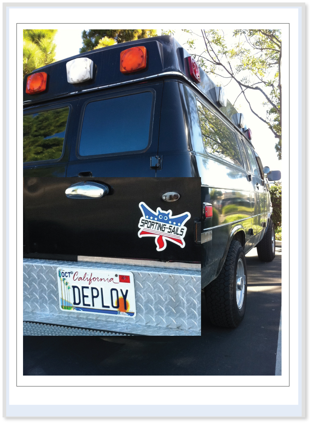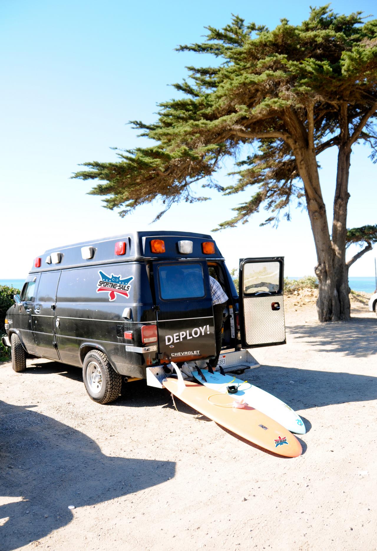 SPORTING-SAILS - Team Sukrafte Surf + Skate AmbulanceDeploying up and down the California coast in search for surf and skate (aka Sukrafte) - The Team Ambulance sports a license plate that reads: "DEPLOY"
